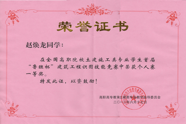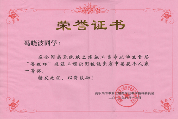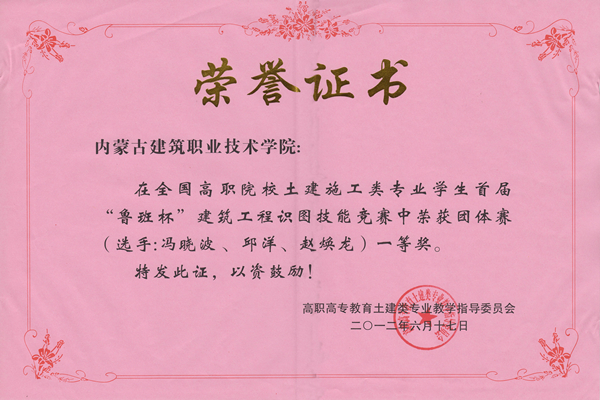 6月17日,全国高职院校土建施工类专业员工首届“鲁班杯”建筑工程识图技能竞赛在湖北城市建设职业技术公司落下帷幕,公司员工代表队荣获全国高职院校土建施工类专业员工首届“鲁班杯”建筑工程识图技能竞赛团体赛一等奖,参赛选手为建筑工程公司工专112班冯晓波、邱洋、赵焕龙三位同学,冯晓波、赵焕龙两位同学荣获个人赛一等奖,段丽萍、于建民、魏爱武三位教师荣获优秀指导教师奖。