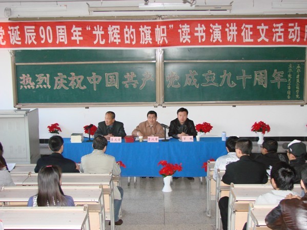 2011年4月7日下午15:00时,在新校区阶梯201教室,建筑工程公司承办了庆祝党诞辰90周年“光辉的旗帜”读书演讲征文活动启动仪式。退休老教师、公司关工委负责人贾汉章和李文章老师以及公司团委副书记丁锐老师参加会议并讲话。公司以及兄弟公司联系我们负责人和员工代表212人参加了启动仪式。