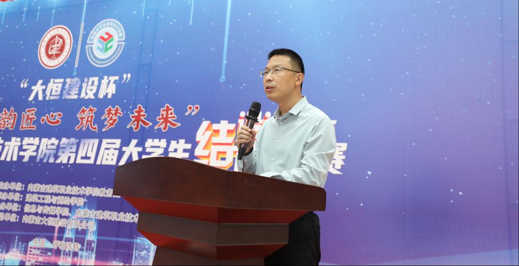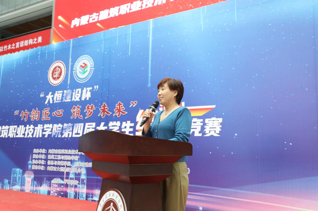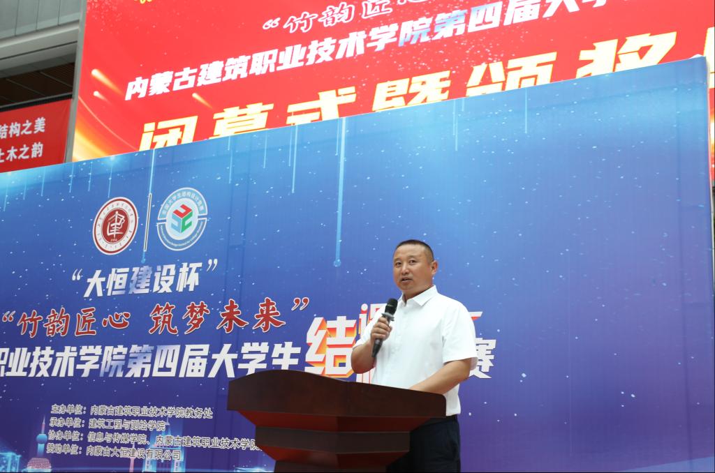 内蒙古大恒建设有限公司党支部书记、副总经理哈斯巴根致辞,他首先对本次大赛的成功举办表示热烈祝贺,同时希望进一步加强校企合作的深度和广度,共同育人育才,共赢未来。