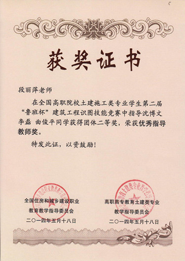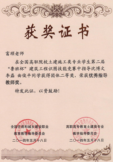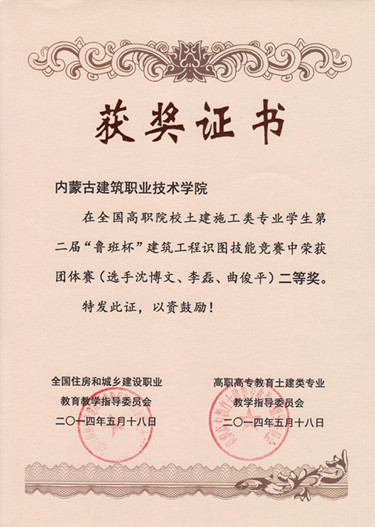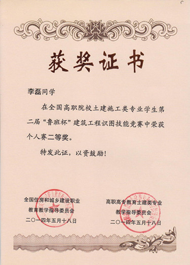 本次大赛共有来自全国168个高等院校的504名选手,参加比赛。建筑工程公司精心选拔出沈博文、李磊、曲俊平3名参赛选手,并指派3名教师利用业余时间对选手精心辅导。比赛中,三名选手不负众望,在参赛的504名选手中脱颖而出,沈博文同学荣获竞赛一等奖,李磊同学荣获竞赛二等奖。