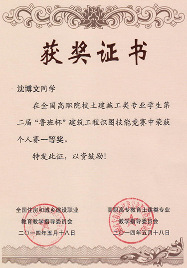 公司沈博文等三名同学在全国高等职业院校土建施工类专业员工第二届“鲁班杯”建筑工程识图技能竞赛中喜获佳绩