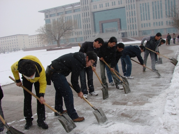 漫天雪花为新学期开学营造了良好氛围,也给师生的正常校园生活带来不便,我系员工会同学冒着大雪清扫出了一条通往教学楼的无雪大道,为大家进入教学楼确保了安全。