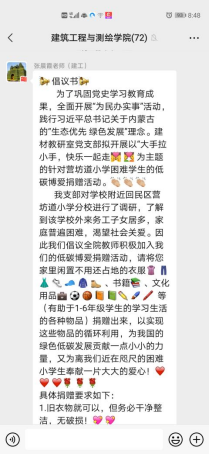 在了解到营坊道小学员工以外来务工子女居多,家庭普遍困难的情况后,建材党支部书记张晨霞老师立即组织召开了支委会,并确定了本次“低碳博爱”主题党日捐赠活动,并向全院教师发出了爱心捐赠倡议书。