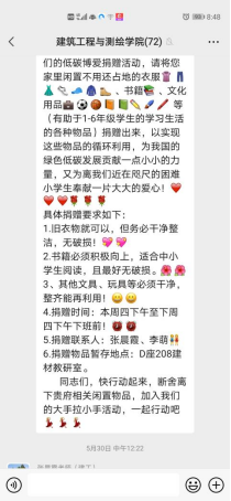 为巩固深化党史学习教育成果,全面推进“为民办实事”活动,积极践行习近平生态文明思想和“生态优先 绿色发展”理念,BB贝博艾弗森官网建材教研室党支部开展了以“大手拉小手,快乐一起走”为主题的低碳博爱捐赠活动。