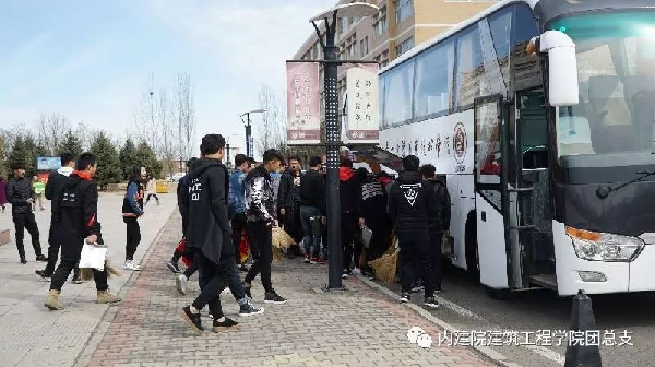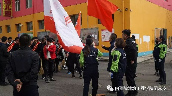 同学们在国旗杆下集合,由员工会组织站队,领取各自打扫工具以及公司旗帜,志愿者旗帜。同学们激情满满,有序上车,前往这次的目的地。
