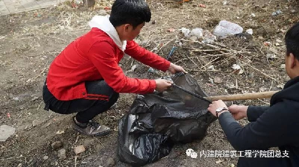 工作开始后,每组同学拿着三四个垃圾袋积极的打扫垃圾,能用手捡的用手捡,大面积的用扫帚扫,有些树丛中没办法用扫帚扫出来的用也找到木棍挑了出来。