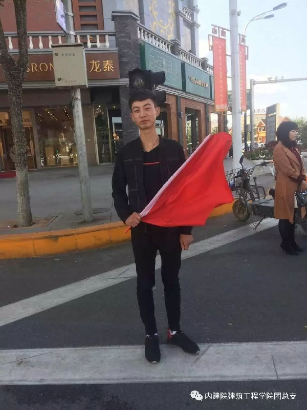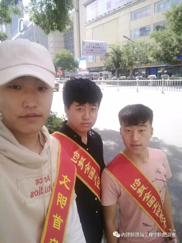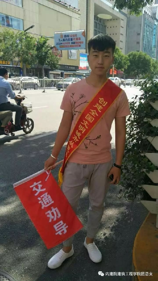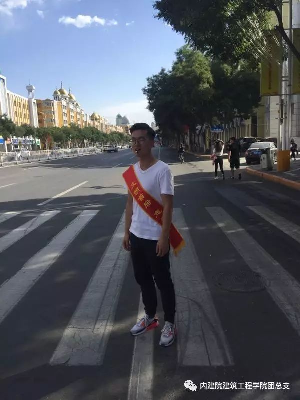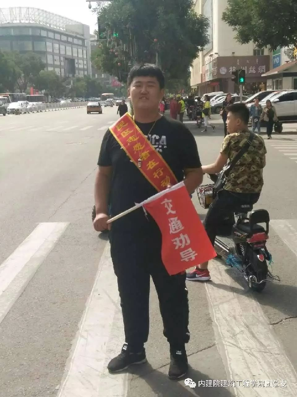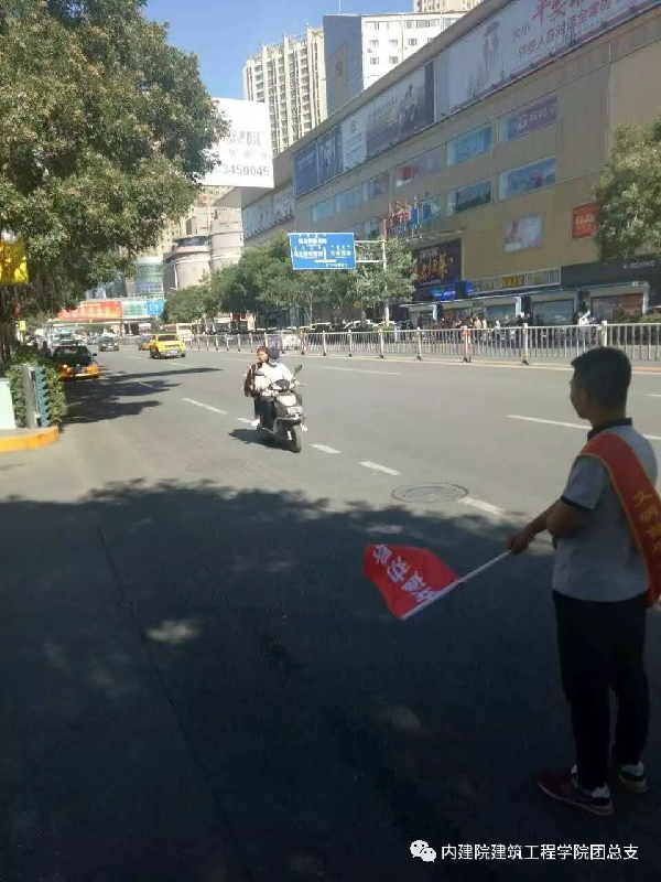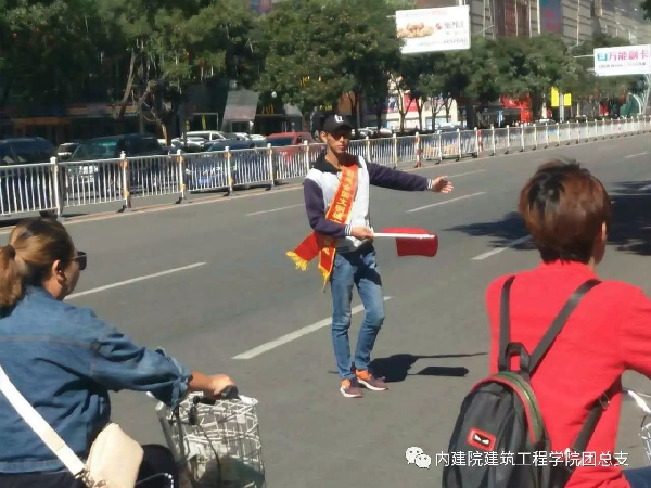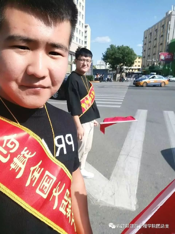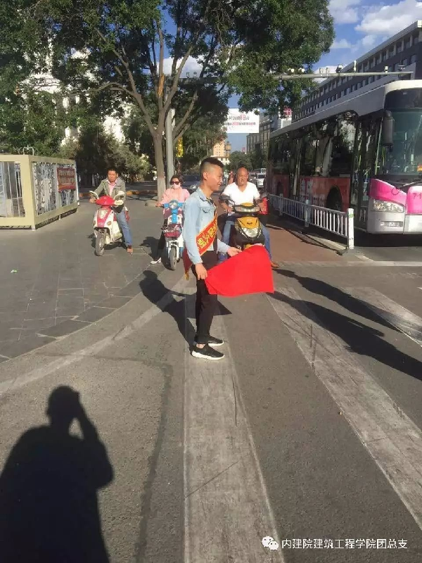 建工1607班的同学佩戴条幅,手举小红旗,在每一个街道,虽然是烈日炎炎,但他们依然坚持协助交警维持着交通秩序,为员工和百姓出行安全做着贡献,也成为魅力呼市又一道亮丽的风景线。